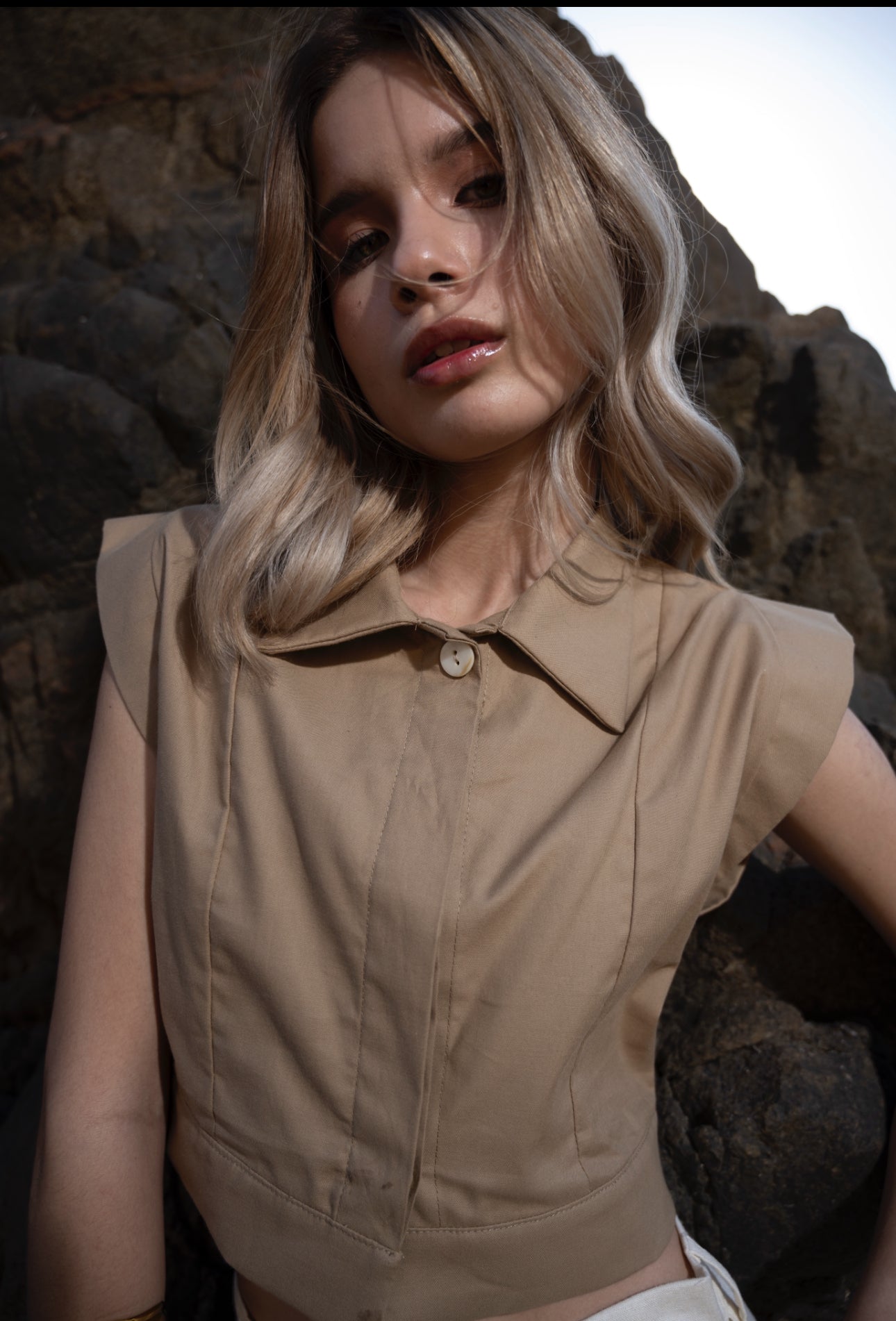 Diseñada para reimaginar lo clásico, Alenia es una camisa de silueta corta confeccionada en gabardina suave en tono arena. Su diseño estructurado en las mangas simula hombreras sin llevarlas, aportando presencia sin rigidez. Los botones de carey quedan ocultos bajo una vista limpia, destacando solo al cierre del cuello como detalle sutil.