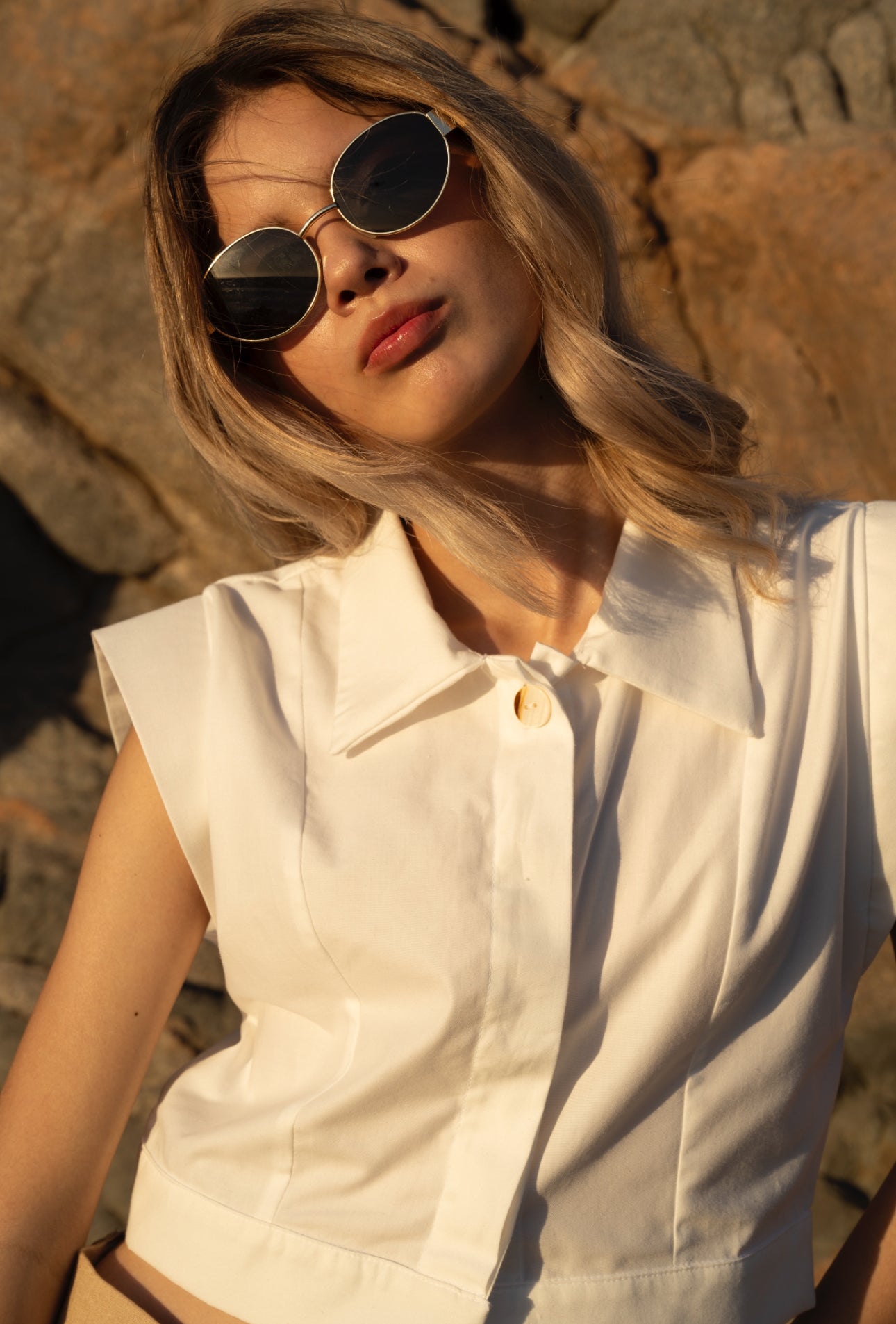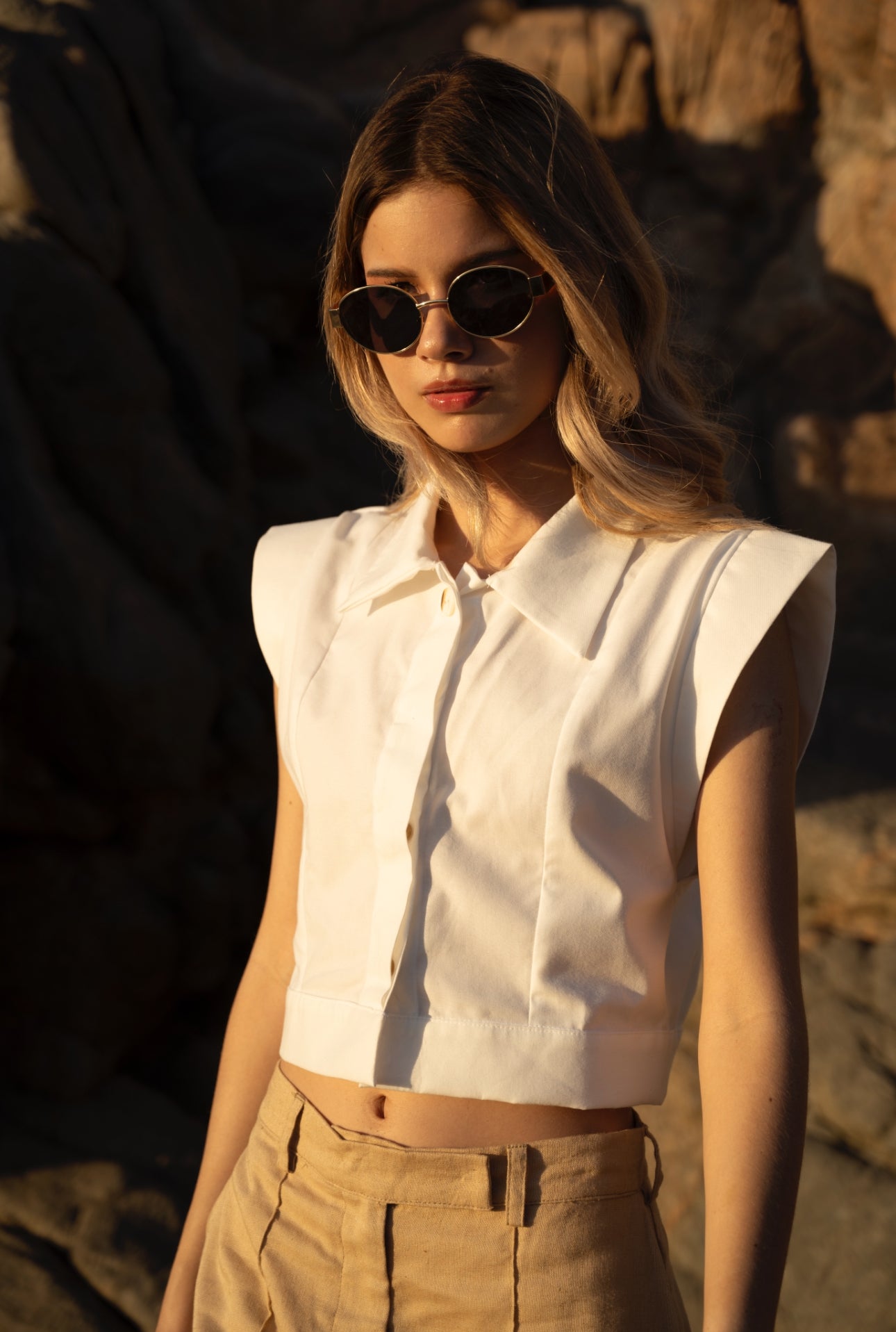 Diseñada para reimaginar lo clásico, Alenia es una camisa de silueta corta confeccionada en gabardina suave en tono marfil. Su diseño estructurado en las mangas simula hombreras sin llevarlas, aportando presencia sin rigidez. Los botones de carey quedan ocultos bajo una vista limpia, destacando solo al cierre del cuello como detalle sutil.