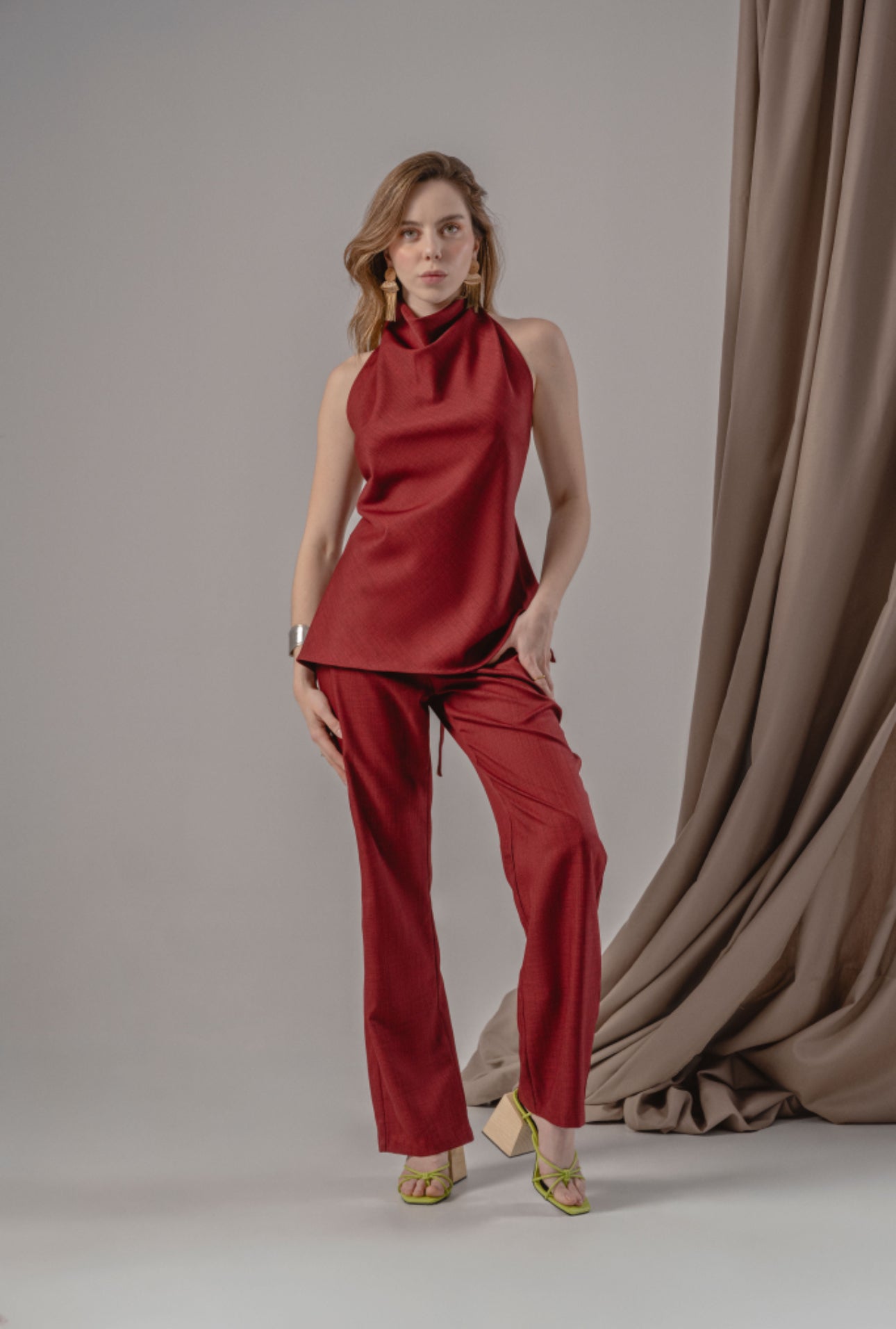 El conjunto Layla combina líneas puras y detalles cautivadores. El pantalón recto, con pinzas que realzan la silueta y cierre invisible, aporta una estructura impecable. La blusa, en un delicado tono moka, enamora con su escote en la espalda, cuello caído que forma pliegues suaves y un amarre sutil que envuelve con gracia. Layla es la esencia de la sofisticación minimalista.