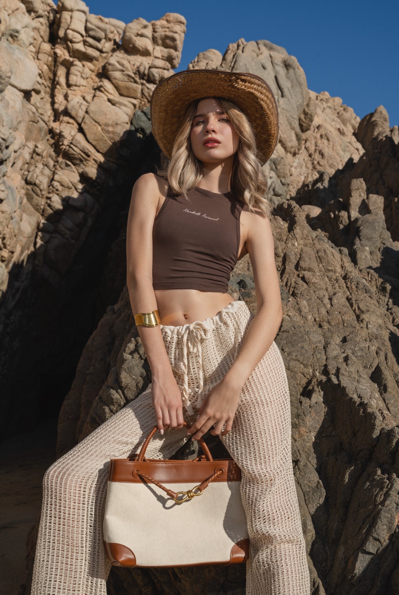 Sus jaladeras con detalle de madera en las puntas evocan lo artesanal, lo que ha sido hecho con calma y con las manos. Una pieza pensada para envolver la piel con autenticidad y acompañarte del mar a la ciudad, entre sombras, sol y movimiento.
