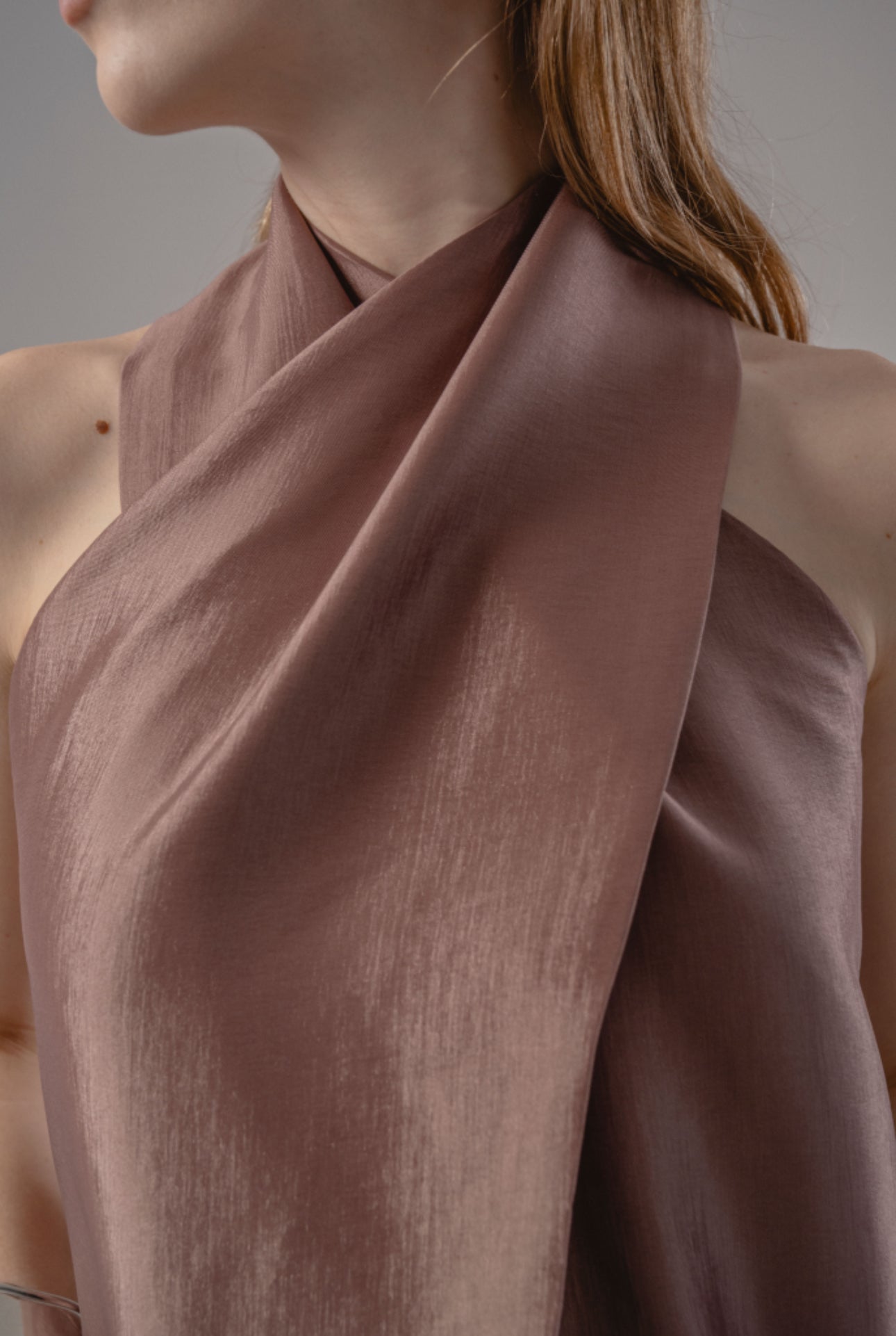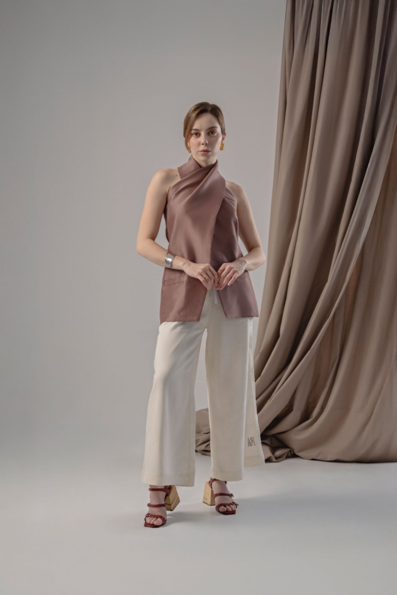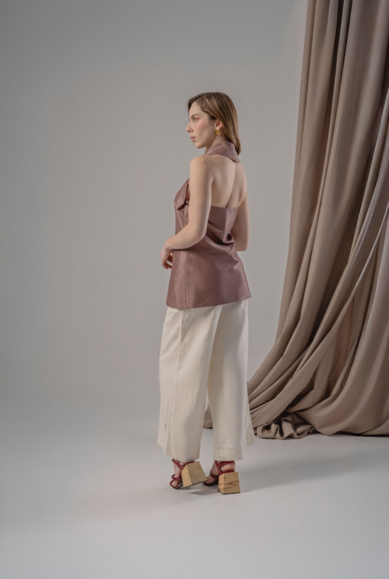 La blusa Sahra es una pieza que fusiona sofisticación y minimalismo. Su diseño en tafeta con un sutil brillo refleja la belleza del desierto al amanecer. El corte cruzado, con un cuello envolvente que abraza suavemente el cuello, evoca las formas orgánicas de las dunas. Los detalles funcionales, como las bolsas, añaden un toque contemporáneo, mientras que su tono café con matices rosados resalta la calidez y profundidad del paisaje.