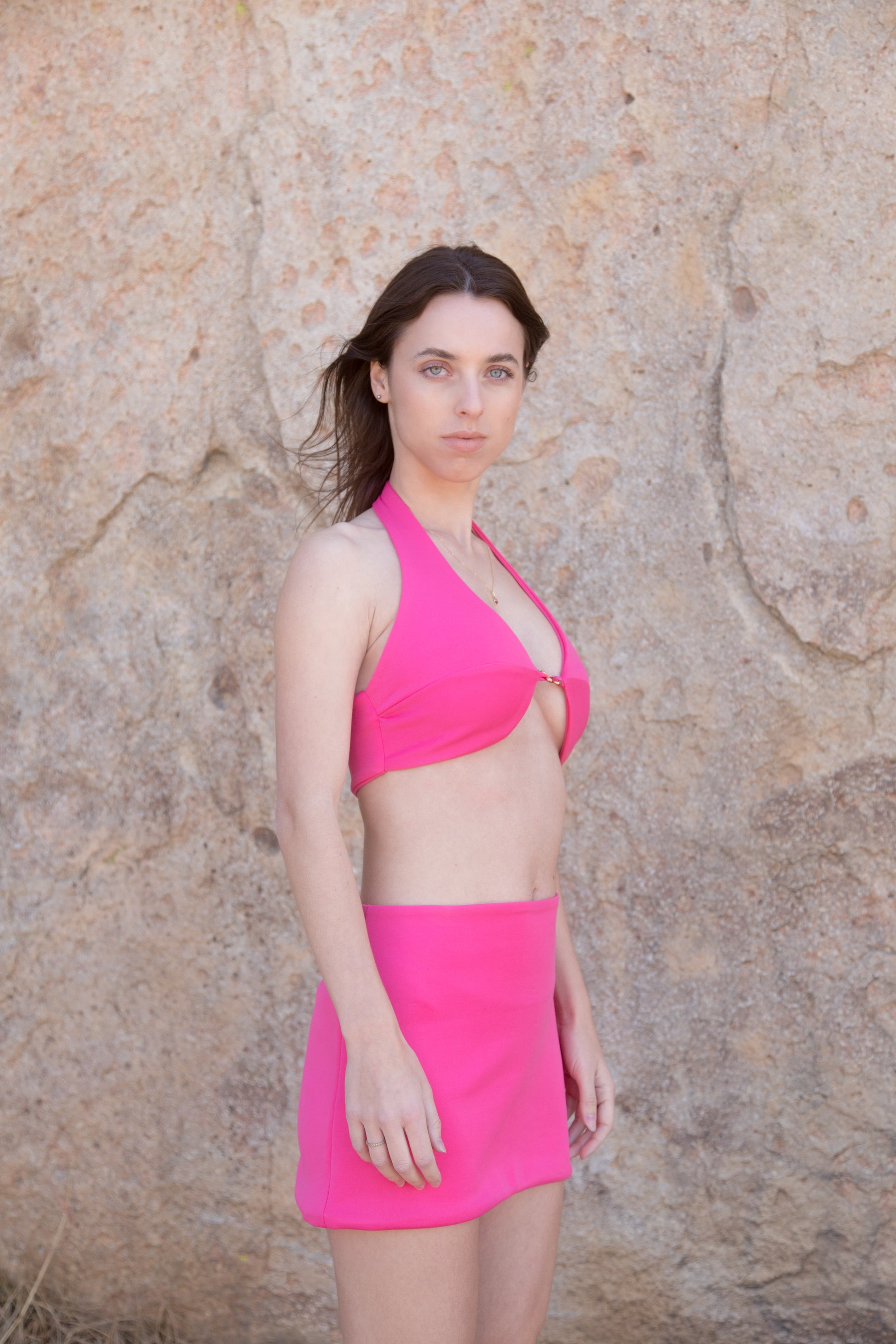 Total look en tono rosa compuesto por top forrado sujeto al cuello con corte en pecho para dar mejor forma y unión en pecho con aro en color rose gold, falda forrada básica con pinzas en trasero y corte en medio sin cierre.