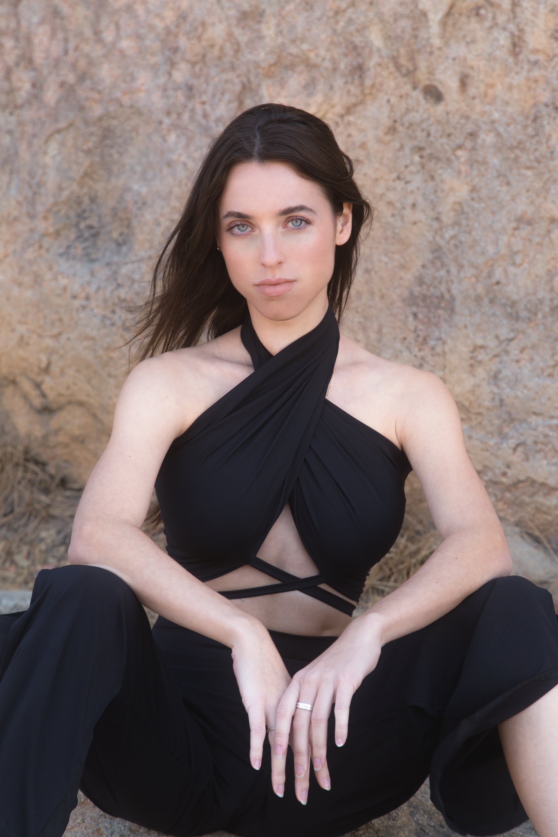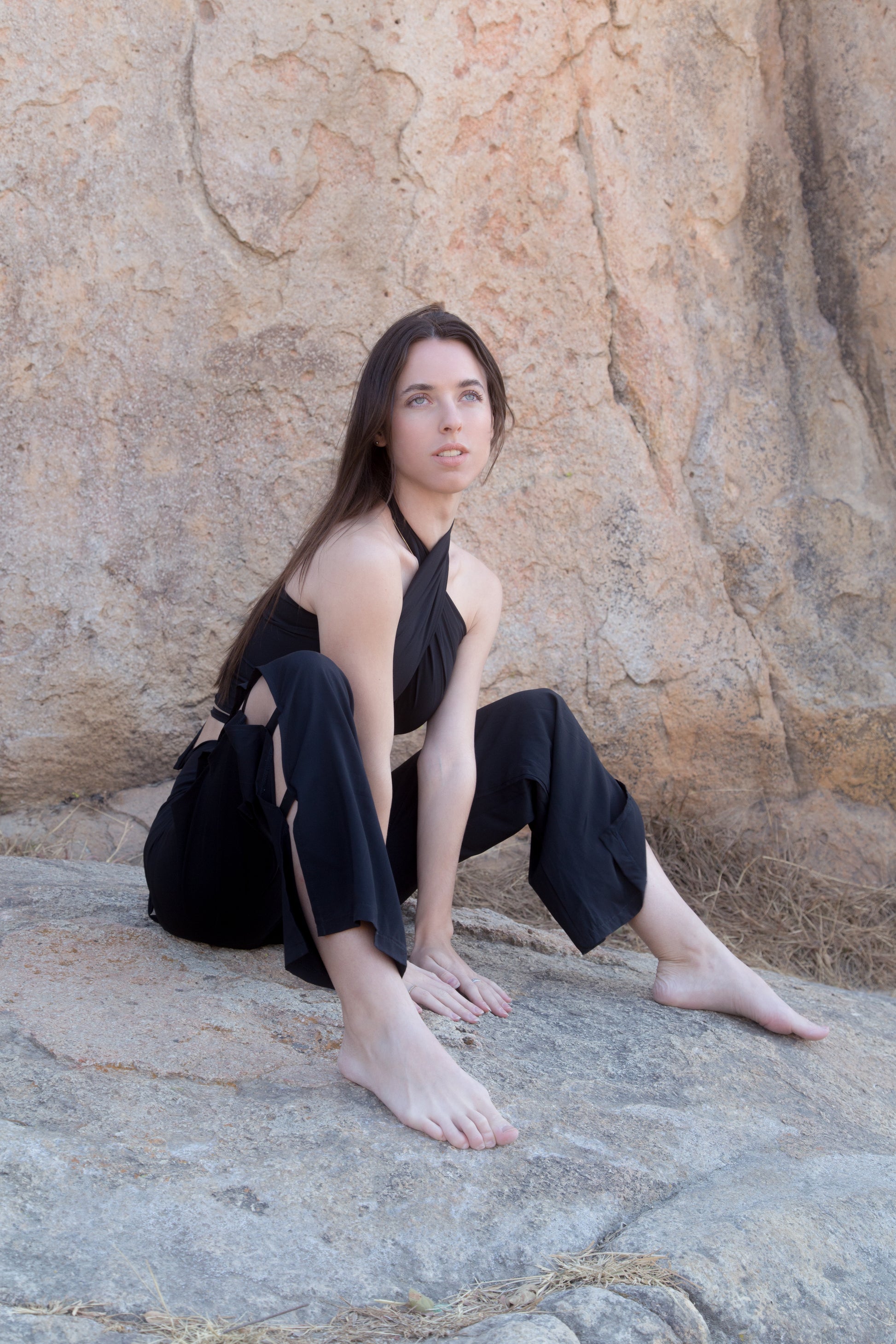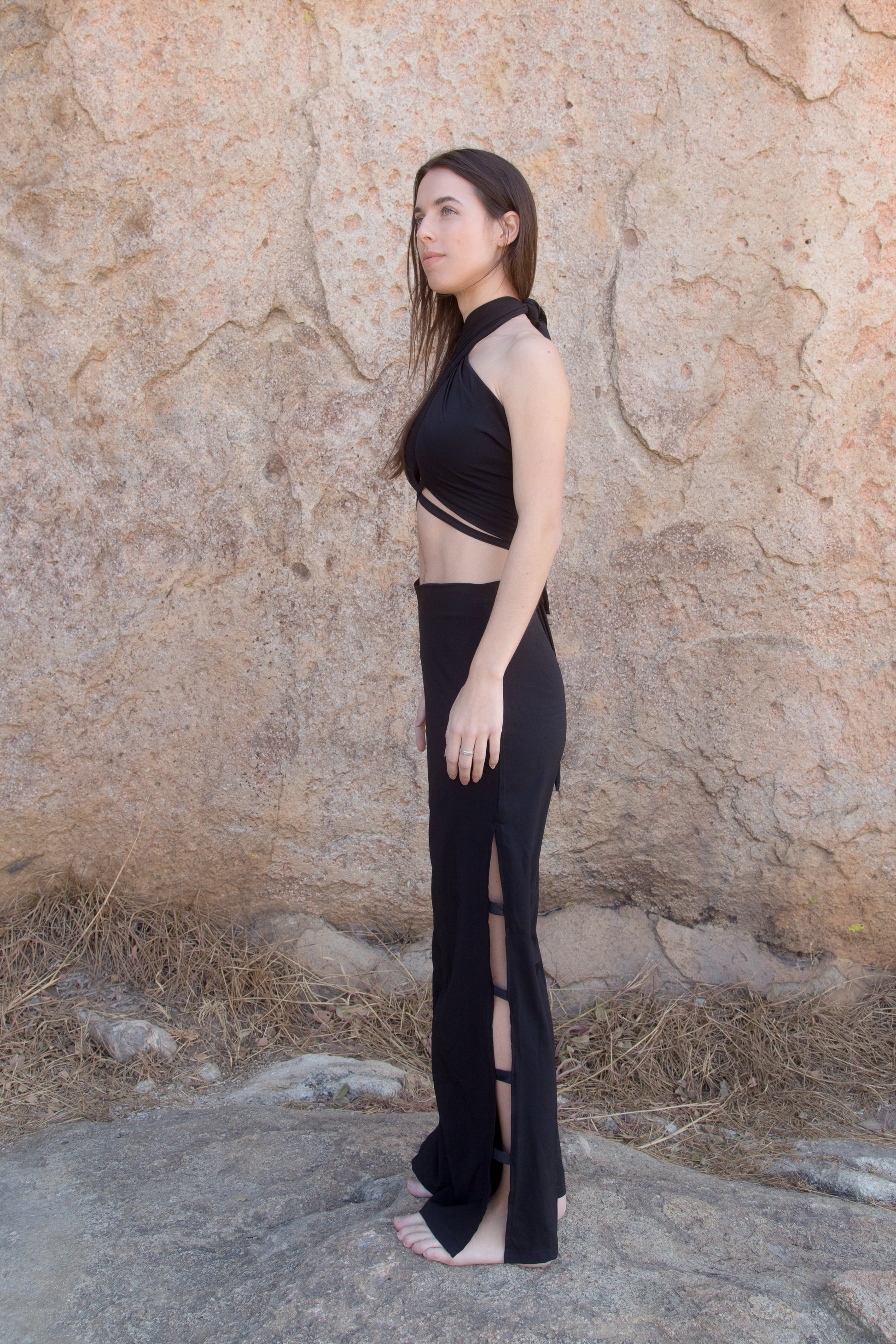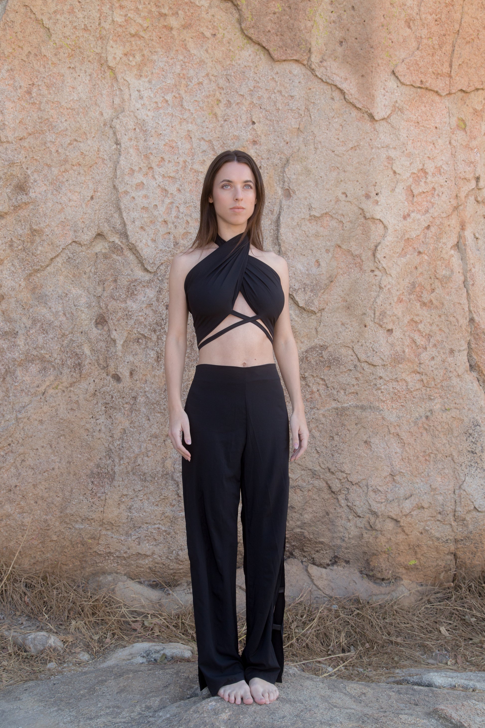 Total look en tono negro mate compuesto por pantalón largo con aberturas laterales y unión con bies satín, top forrado sujeto de cuello con lazos unidos en pecho que rodean la cintura.